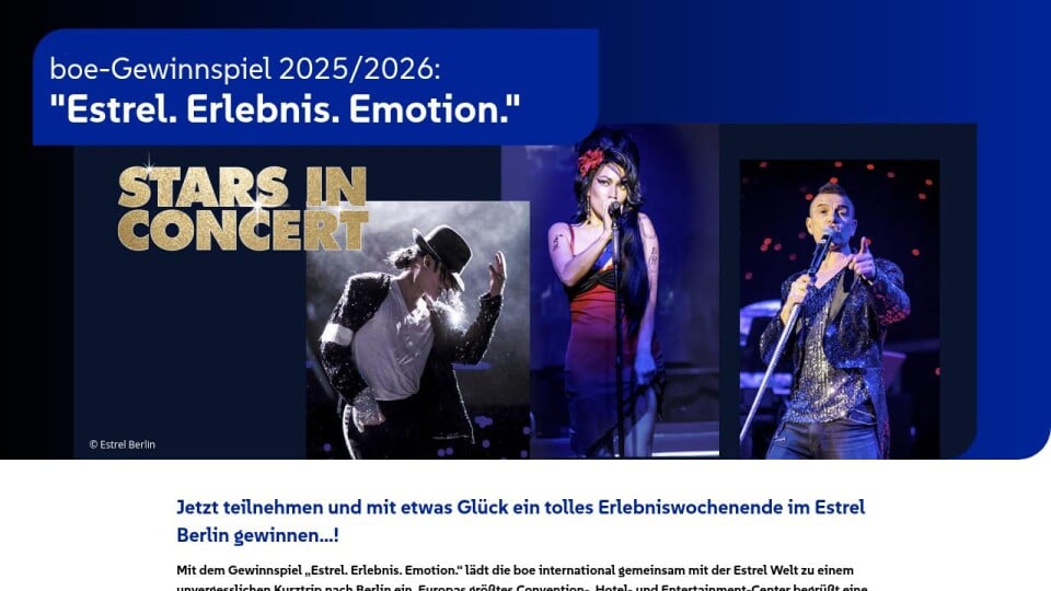 Mit dem Gewinnspiel „Estrel. Erlebnis. Emotion.“ lädt die boe international gemeinsam mit der Estrel Welt zu einem unvergesslichen Kurztrip nach Berlin ein. Europas größtes Convention-, Hotel- und Entertainment-Center begrüßt eine Gewinnerin / einen Gewinner mit Begleitung zu zwei erlebnisreichen Tagen voller Highlights.