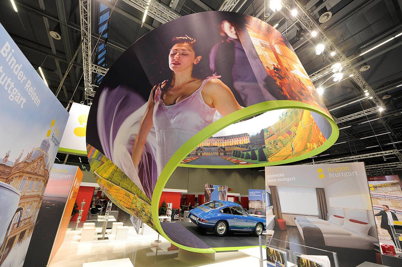 Gebogene Flächen, geschwungene Kanten – lebendig, fließend, skulptural – bilden das gestalterische Herzstück dieser außergewöhnlichen Messekonstruktion. © hms design solutions